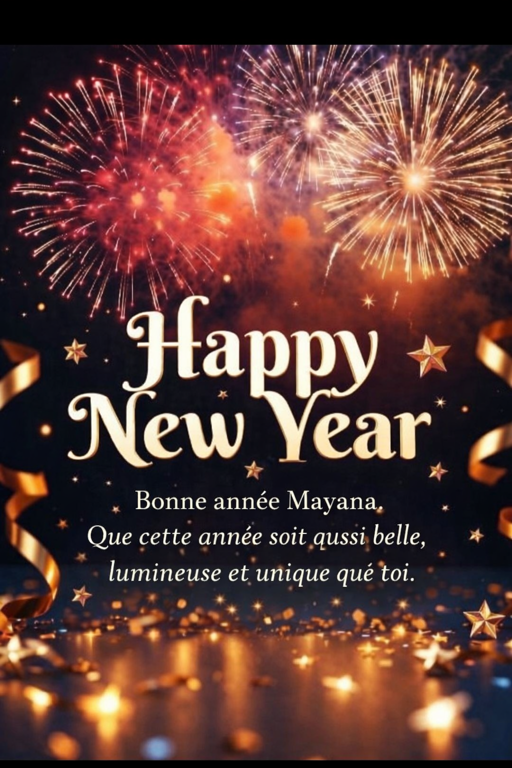 Bonne année, ma chère Mayana. Pour 2026, mon plus beau souhait est que tu continues de briller comme tu le fais. Merci d’être cette personne si spéciale dans ma vie. Que cette année nous rapproche encore plus et nous offre des moments rien qu’à nous. »